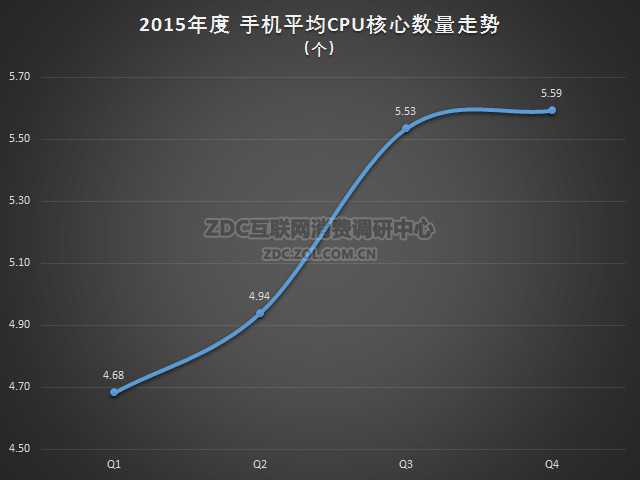 从手机平均CPU数量走势来看,2015年度手机平均CPU核心数量从4.68上升至5.59,Q3增长加速,Q3上升走势趋缓。