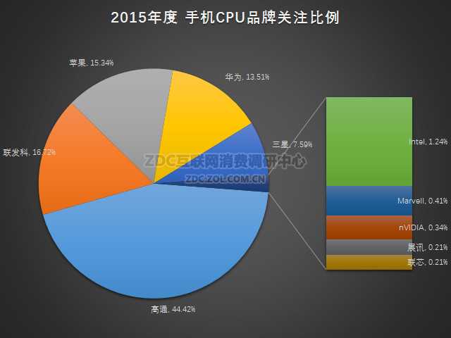 从手机CPU品牌关注来看,2015年度,高通CPU获得的用户关注比例最为集中,达到44.42%,其次为联发科,获得16.72%的关注比例。苹果与华为CPU关注比例分别为15.34%、13.51%。三星自主CPU关注比例不足一成,为7.59%。其他CPU关注度均在2%以下。