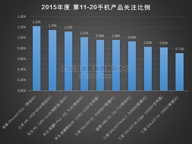 前11-20位产品中,依旧是苹果产品领衔。苹果iPhone 6 Plus(移动4G)以1.22%的关注比例位居第11位。小米M4(3GB RAM/移动4G)与华为P8 (GRA-UL10/高配版/双4G)分别排在第12、第13位,关注比例差距微小。整体来看,前11-20位产品三星产品数量优势明显,共四款产品入围,其次为华为,三款上榜。