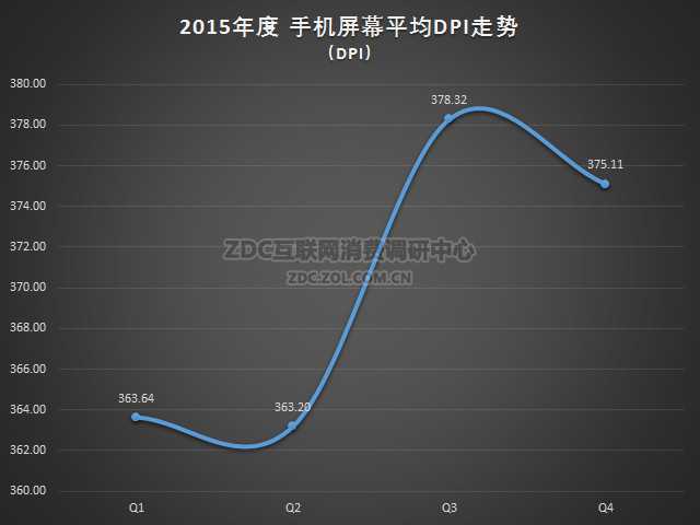 从走势来看,2015年度,手机屏幕平均DPI走势先升后降,Q3达到378.32,之后小幅回落。