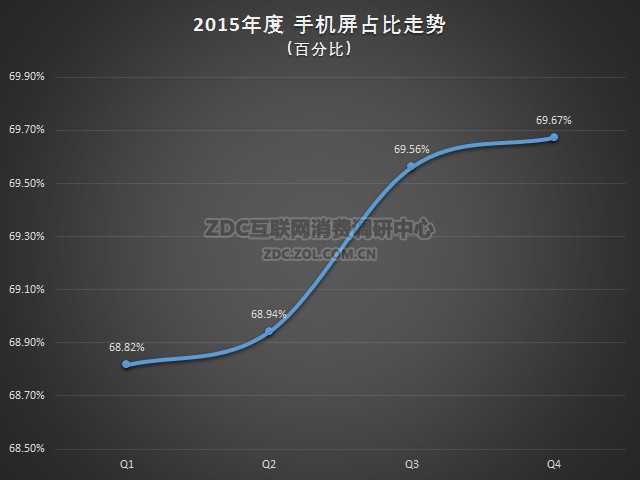 从2015年度的走势来看,手机屏幕占比呈持续增大走势,Q4手机平均屏占比达到69.67%,较Q1增长了近1个百分点,这也意味着手机屏幕边框越来越窄,屏幕越来越大。