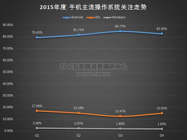 从走势来看,2015年度,Android系统关注度呈先升后降的走势,Q3达到最高点,为84.77%,Q4小幅下滑2.12%,但仍在八成以上,相较于其他系统保持着绝对的领先优势。苹果iOS系统关注度则呈先降后升的走势。Windows Phone系统关注度持续萎缩。