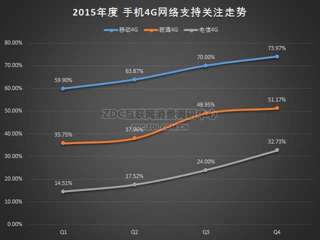 2015年可以说是4G手机快速发展的一年,用户关注度连续四个季度稳步增长,加上运营商大力下调4G资费,4G手机已经占据了手机市场的主流。从未来来看,4G手机将加速向三四线城市渗透、向小城镇甚至乡村渗透,2016年千元4G手机将成为新战场,而主导市场的1000-3000元机型仍将是主战场。