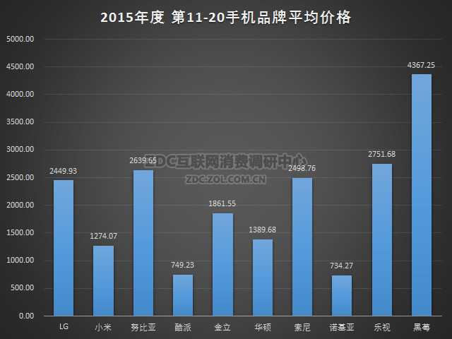 第11-20位的十大品牌中,黑莓品牌均价最高,达到4367.25元,与苹果还要高。LG、努比亚、索尼、乐视四家品牌手机均价则分布在2400-3000元之间。小米、金立、华硕均价在1000-2000元之间。酷派、诺基亚均价则均不足1000元。