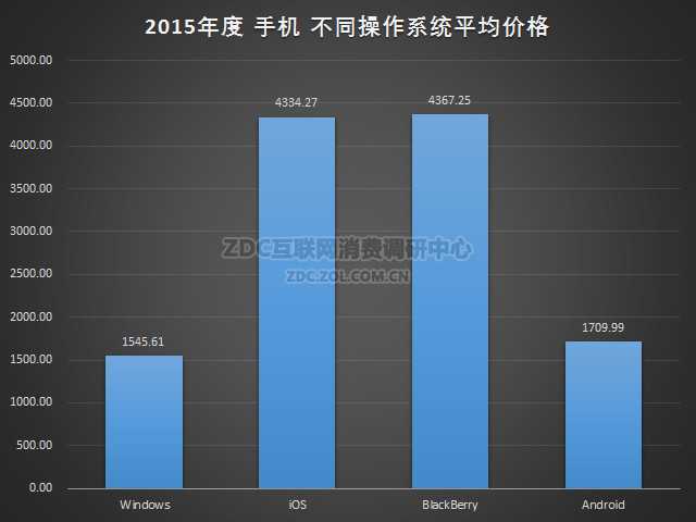 2015年度,中国手机市场上,搭载Android系统的手机均价为1709.99元,处于用户关注度最集中的1000-1999元这个价格区间。苹果iOS系统手机均价为4334.27元,处于第一阵营。Windows Phone系统手机目前已经基本无旗舰,均价下降至1545.61元。
