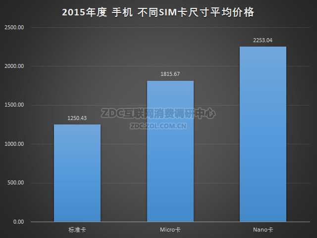 从支持不同SIM卡的手机均价来看,2015年度,中国手机市场上,支持Nano卡的手机均价最高,为2253.04元,其次为Micro卡手机,均价1815.67元。支持标准卡的手机均价最低,为1250.43元。