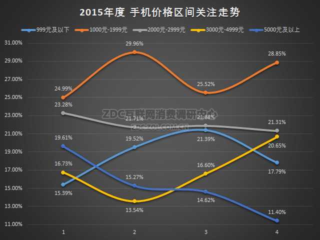 从走势来看,用户关注度最为集中的1000-1999元机型关注度起伏较大,在24%-30%之间波动,这与各个季度此价格段机型上市新品数量最多有直接关系。2000-2999元机型关注度走势相对稳定。