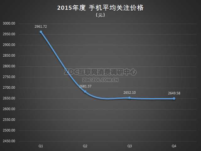2015年度,手机关注均价整体呈下降走势。Q4为2649.58元,较Q1的2961.72元下降了300余元。从时段来看,Q2手机关注均价下降幅度最大,之后连续两个季度保持平稳走势。