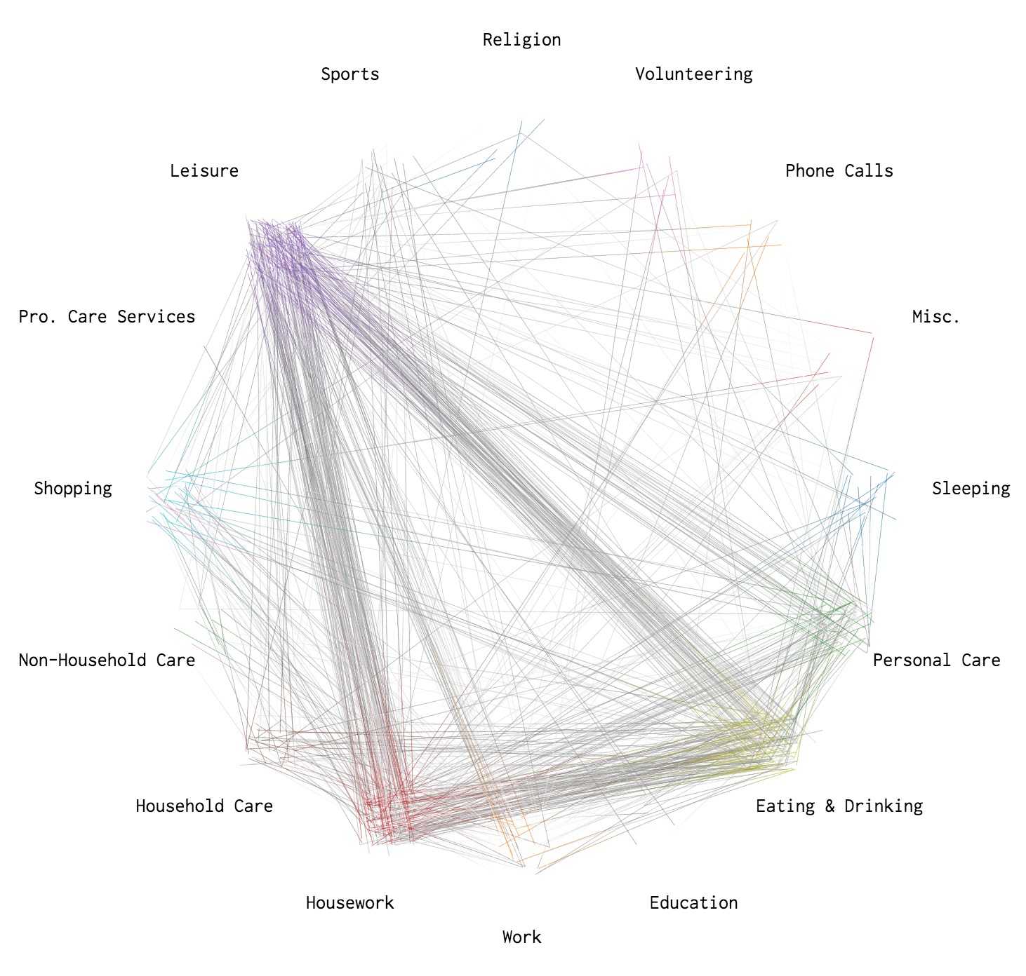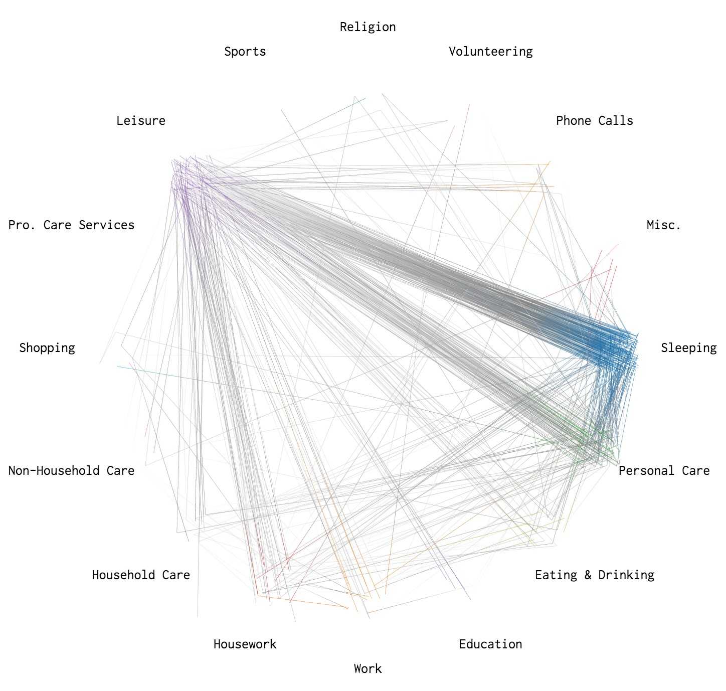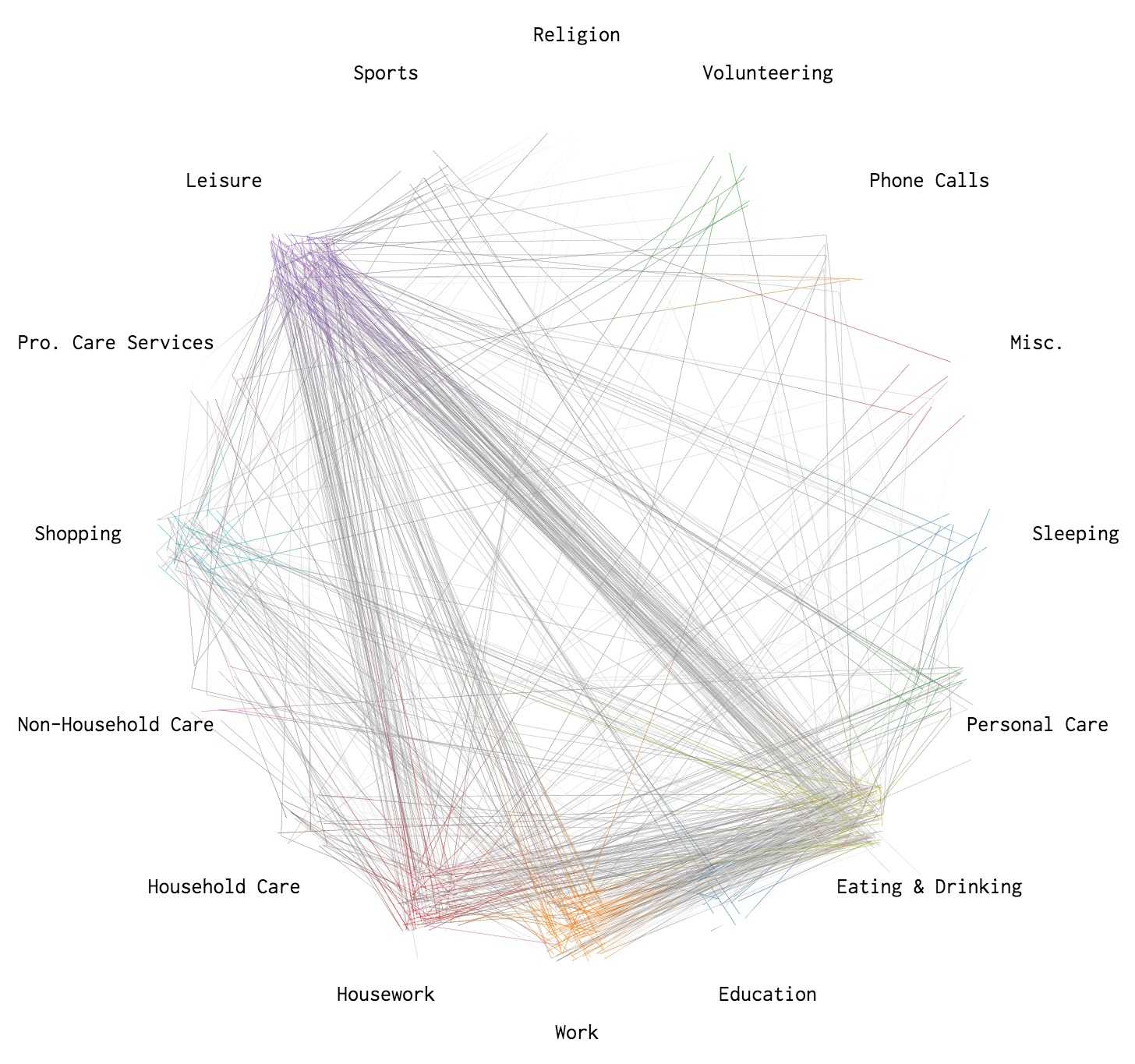 因此我们详细地调查了2014年美国人时间使用调查的微观数据,这个调查采访了数以千计的美国人在24小时里都做了什么。我们使用这些数据模拟了1000名美国人代表一天的活动,细化到分钟。