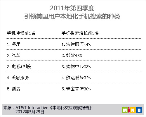 AT&T Interactive公司2011年第四季度的《本地化交互观察报告》显示,无论是PC电脑搜索还是移动智能终端搜索,餐馆与汽车修理服务位居搜索量的前两位。相比电脑用户,移动用户更喜欢搜索影院,美容服务和酒店等信息,表明智能手机用户更希望获得周边的服务信息。