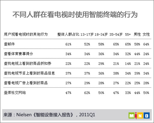 此外,尼尔森的报告还发现,18-34岁的青壮年人群在所有人群中,最喜欢通过智能终端“查找电视上看到的商品折扣券”。而“查邮件”和“登录社交网站”是整体人群最爱的两类观看电视时的同步行为。