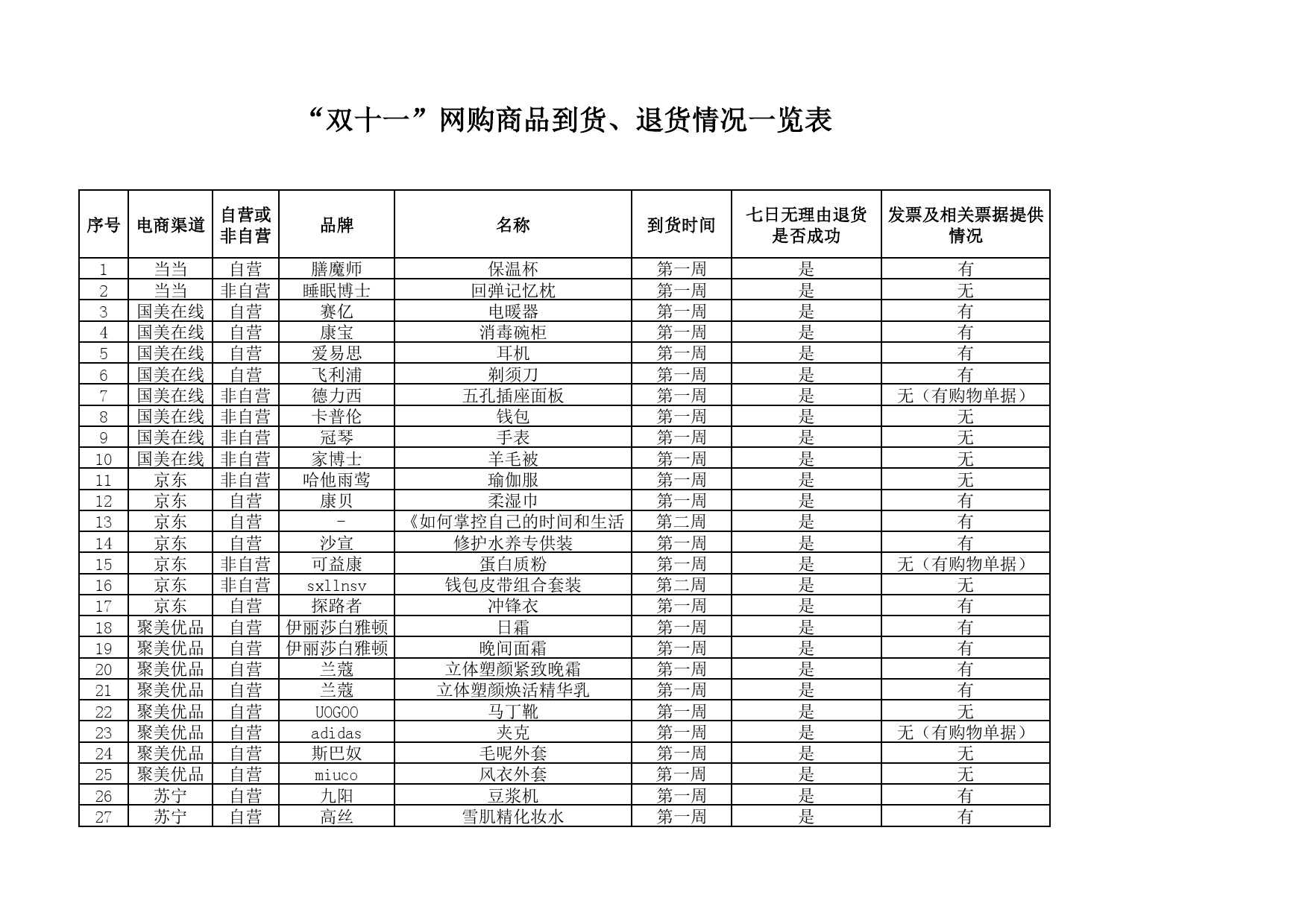 本次“双十一”网购商品到货情况总体顺利,94款商品中,仅有1款未到货(截至12月4日);电商平台和商家“七天无理由退货”规定执行情况良好,但个别电商平台退款方式欠妥;部分电商平台和商家提供发票或票据情况不容乐观;个别电商平台网购流程设置不尽合理。