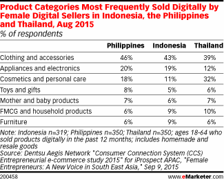根据2015年8月的调查,数以百万的东南亚女性在网上卖东西已建立事业基础或补贴家用。在印度尼西亚、泰国和菲律宾,相当一部分女性网民是网络卖家。