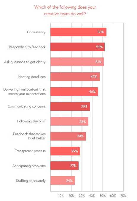 营销人员相当满意创意团队的一致的反馈,但是很怀疑他们预见问题的能力。不足1/3的营销人员认为创意是一个移植的过程,还有一部分人认为创意部门擅长自给自足。