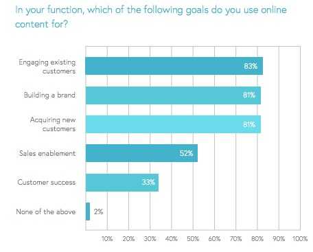 内容营销已经不是什么新鲜事了。大量的品牌已经建立完善的内容营销策略,正在创建更好的内容。这意味着内容更精良了,因此品牌如果要脱颖而出需要发布有吸引力的内容。如下图显示的,内容营销人员正在使用内容来建设品牌,吸引消费者参与,并增加销量。