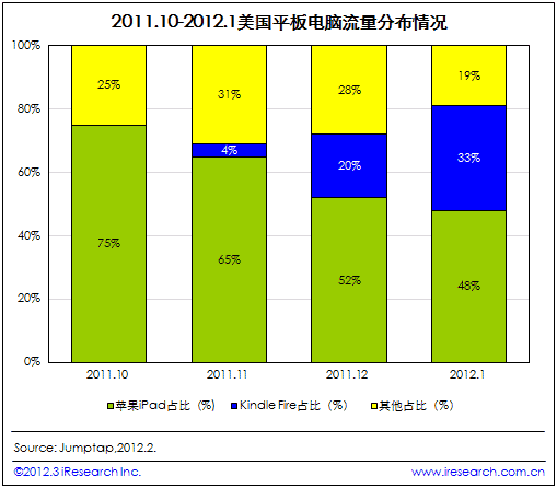 iResearch艾瑞咨询整理Jumptap2012年2月发布的数据发现,2012年1月美国平板电脑流量中,有33%的流量产生于Kindle Fire,另外有48%的流量产生于苹果iPad。2011年10月苹果iPad产生的流量占美国平板电脑产生总流量的75%。