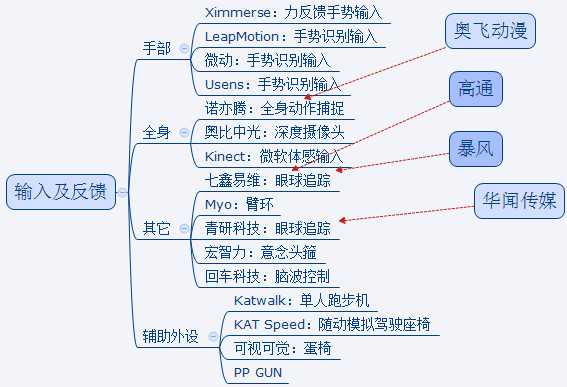 输入及显示设备共同构成虚拟现实体验方案,我们此处也进行了大致的区分,但现在的显示设备很多也包含了相应的输入设备。我们按应用的空间大小,把系统集成方案大致分成大空间,客厅级(PC 级)和移动式三个大类。由于很多输入及反馈设备也可以独立于头显之外,所以也把它们单独分出一类。