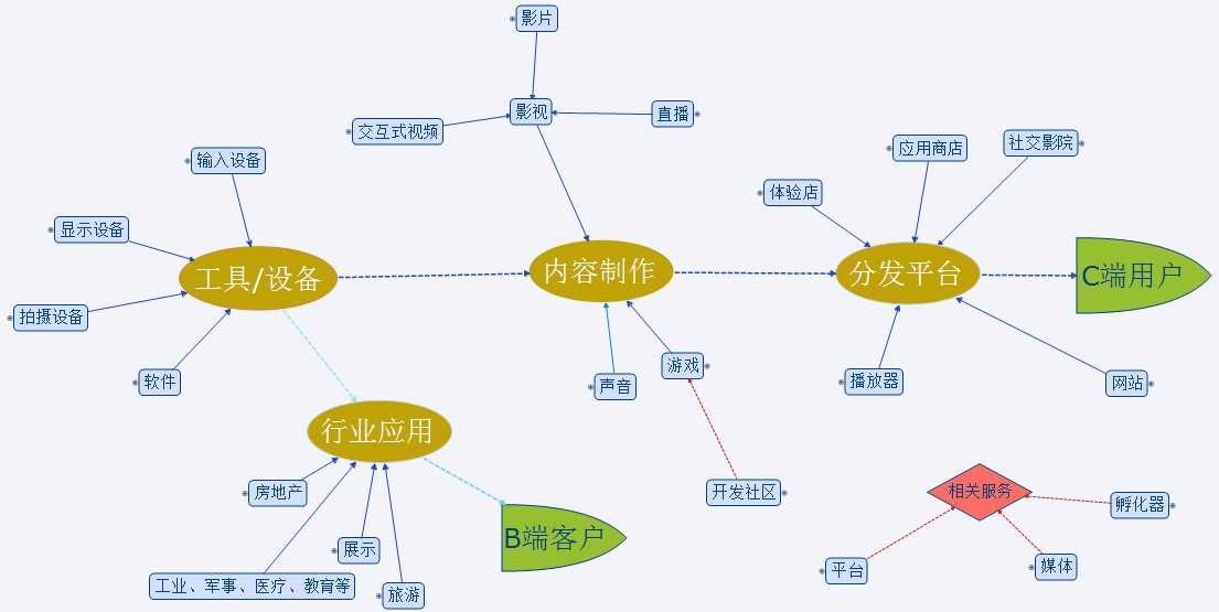 综合目前了解的情况,我们简单画了个产业链图。后面分别从工具设备、行业应用、内容制作、分发平台、相关服务几个方面具体介绍。