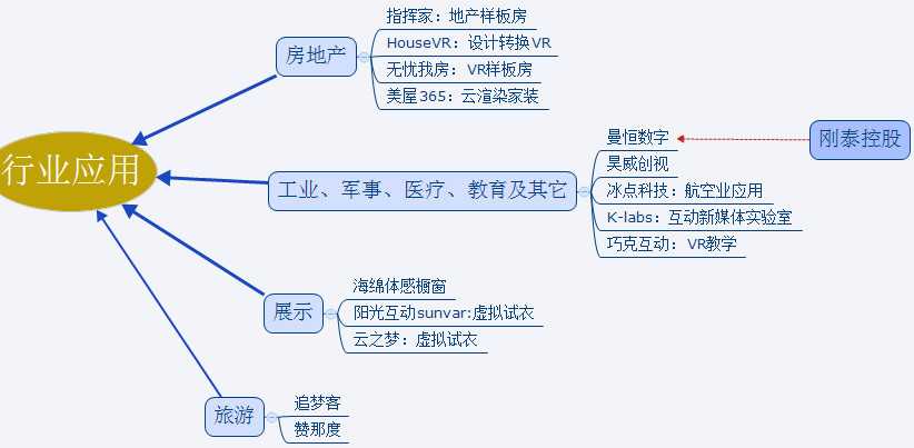行业应用是 VR 很早就投入应用的领域,涉及到的行业非常多,过去主要集中在工业,高等教育,国防等,今年来随着 VR 头显的推广,应用领域离大众变得更近,如房地产、展示等,旅游方面也有追梦客和赞那度参与进来。
