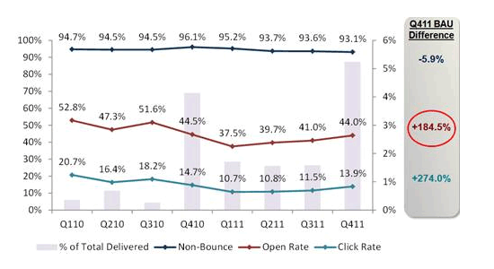 - 2011年Q4触发是邮件的总体打开率比BAU邮件高出93.8%