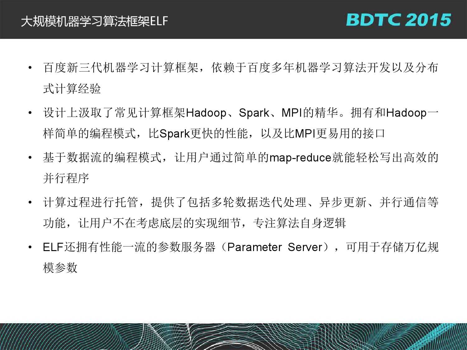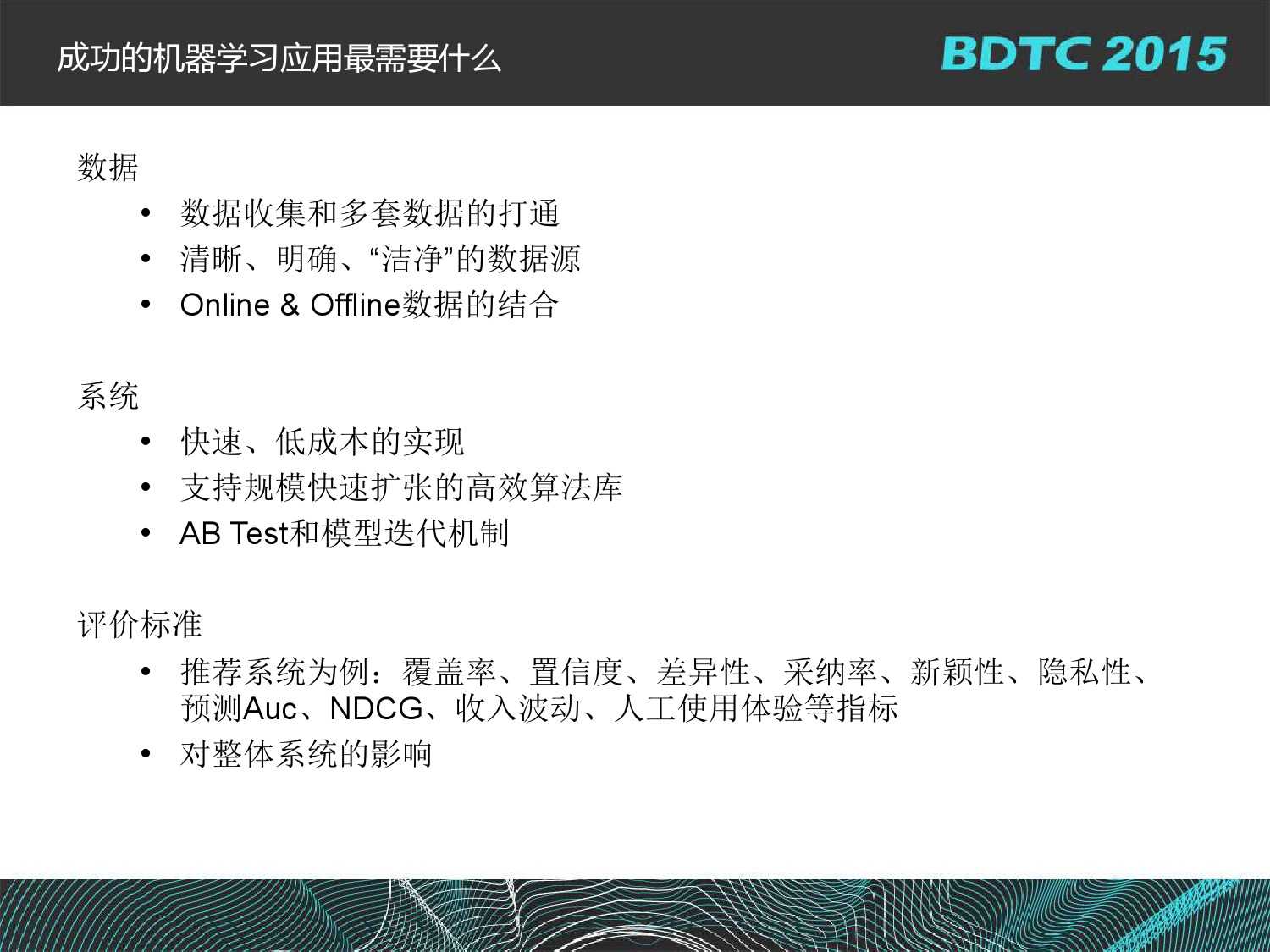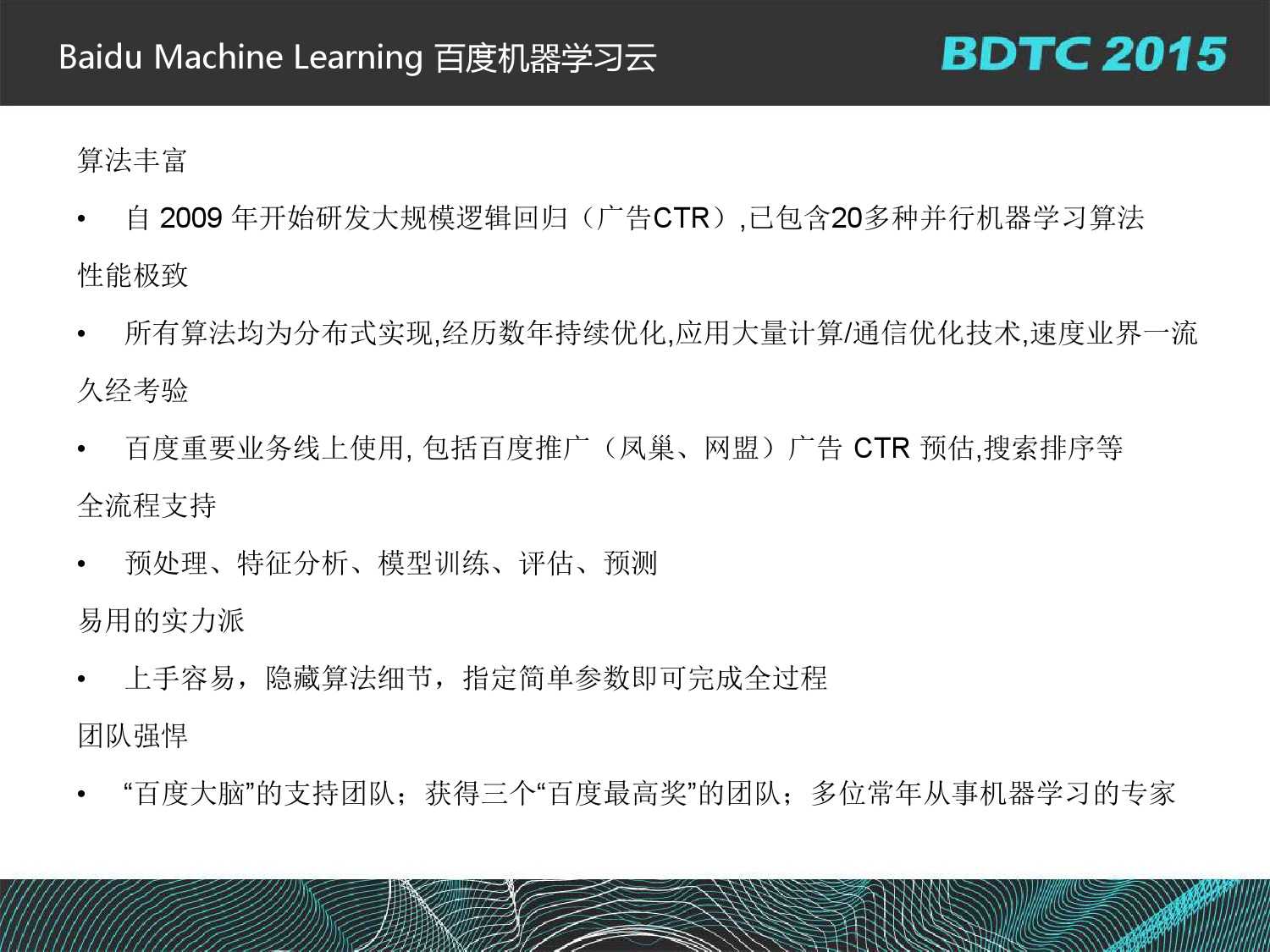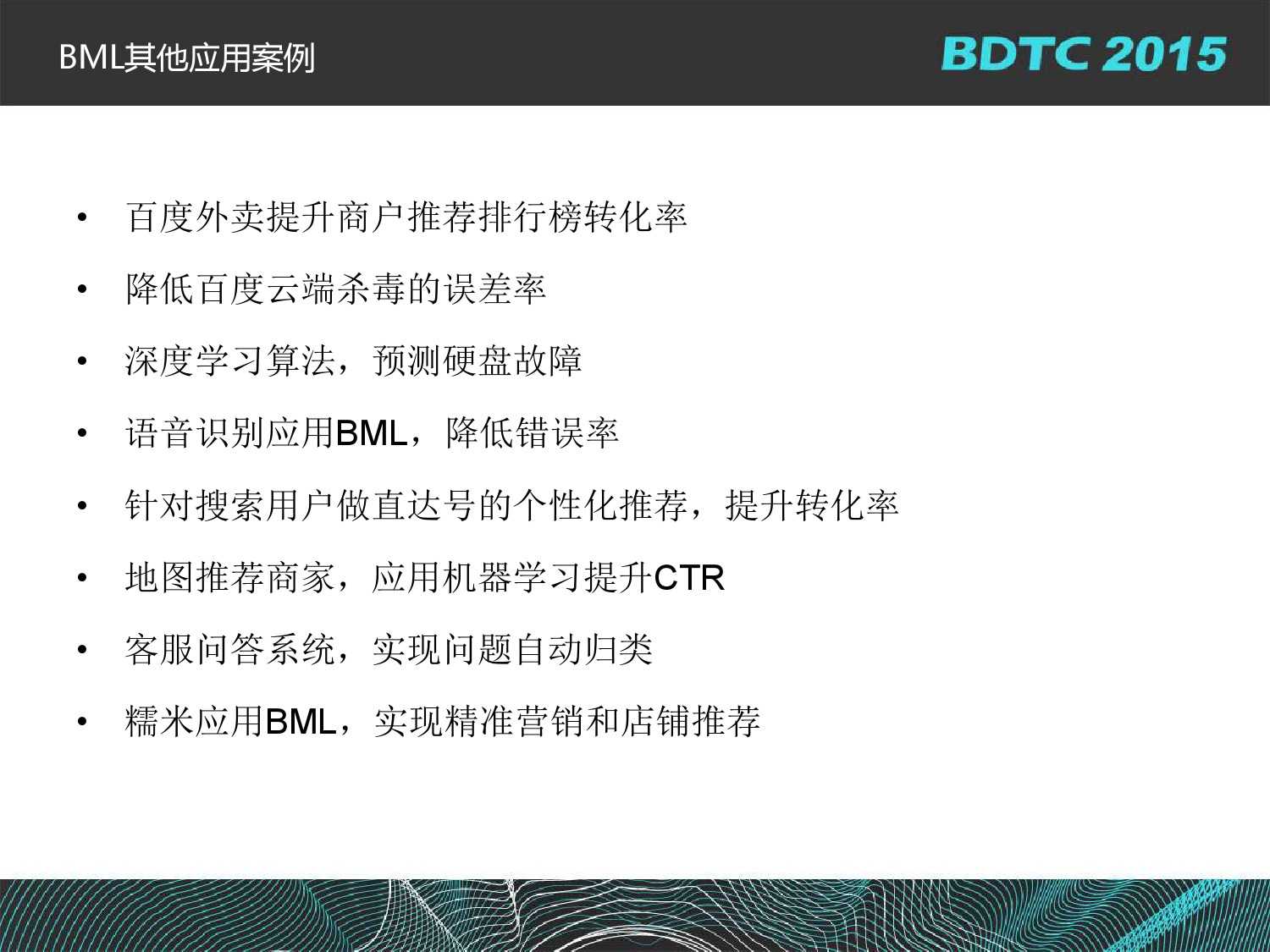 百度基础架构部高级架构师沈国龙:BML百度大规模机器学习云平台实践 更多阅读:美国创业孵化器孵化的13个机器学习和数据科学企业大数据和AI策略–面向投资的机器学习和另类数据方法(附280页报告)腾讯QQ大数据:机器学习建模问题中的特征构造方法Gartner:2015新兴技术发展周期简评:大数据实用化、机器学习崛起Dun&Bradstreet:2/3的商业领袖认为数据对他们发展业务有帮助构建机器学习系统的20个经验教训Precima:机器学习零售革命HealthTransformer: 2017年AI和机器学习公司占医疗科技投资交易的12%Kaggle:2017机器学习及数据科学调查在合适的地方,机器学习带来的将是一场革命关于如何解释机器学习的一些方法机器学习:能通过样本进行学习的计算机的力量与希望Shivon Zilis:机器学习产业生态图3.0版机器学习对 SaaS 行业的影响机器学习和统计模型的差异