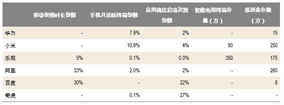 图:企业在视频,手机终端,应用商店,电视和OTT终端上的份额比较