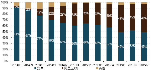 阿里是小米的长期竞争者? 还是只是一个钱堆出来的纸老虎?在手机这个正面战场上,阿里云采取农村包围城市的策略在逻辑上正确,获取手机终端份额的阻力不大,但阿里云OS手机的用户价值需要打个问号。根据Talkingdata的监测和BLRI的预估,2015年8月份,苹果,三星,小米,华为活跃设备份额分别为27%,15%,10%和8%,乐视,奇虎这些新晋厂商目前未挤入前30。而中小手机厂商(排名前10之外)共计占有活跃份额25%左右,这些中小厂商均是阿里云OS的潜在合作伙伴,这些份额都是阿里云OS潜在的市场份额。我们预估阿里云OS份额目前只有2%,上升空间仍然很大。但这些中小厂商的目标用户市场多以低端消费群体为主,缺乏品牌忠诚度,品牌换手率很高,这些装机量对阿里生态的价值价值有多少贡献值得怀疑,一旦补贴停止,下一波供货可能就不是YunOS手机。