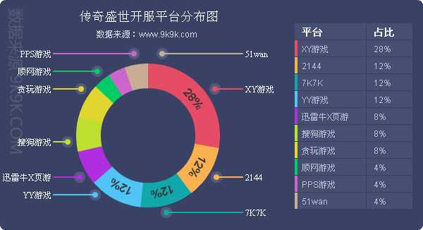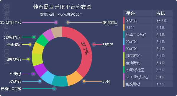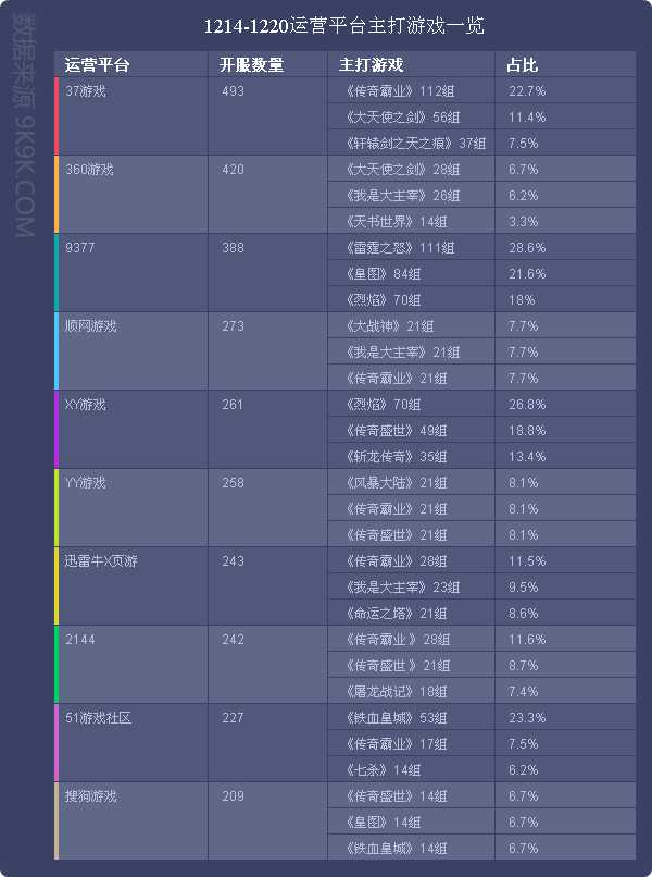 点评:本周《传奇霸业》开服稳定,在各平台的开服占比变化不大。新增占比平台51wan,开服频率为1服/天