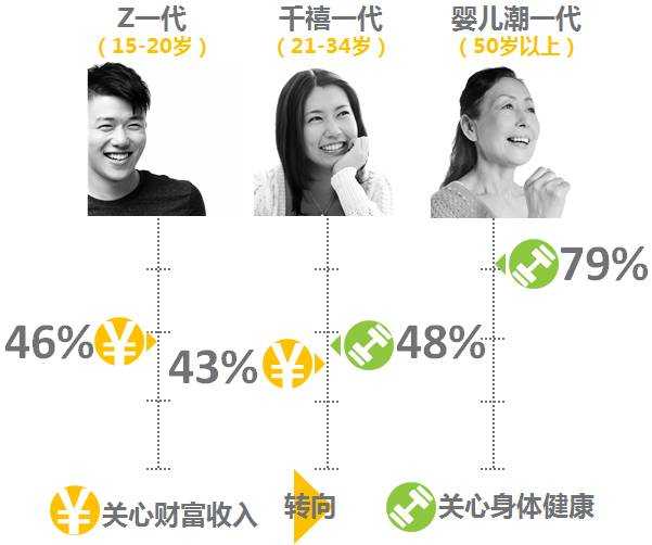 当被问及对未来的期许,受访者们的关注点随着年龄的增长从富裕变为健康。挣钱是35岁以下年轻人“Z一代”(46%)和“千禧一代”(43%)的主要目标,这一比例在年长的消费者中下降很多。接近五成的“千禧一代”(48%)表示“身体健康”是他们的最主要的愿望,而在“婴儿潮一代” 中,对健康的关注度达到了八成(79%)。