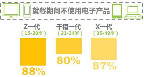 然而,与家人共处的时间里,“低头族”们能够放下手机面对面吗?尼尔森调查显示,消费者在家就餐时仍然保持了良好的传统。超过八成的“千禧一代”(80%)和“Z一代”(88%)受访者表示,他们在家庭用餐时间一般不会使用电子产品。87%的“X一代“消费者也表示了相同的生活习惯。