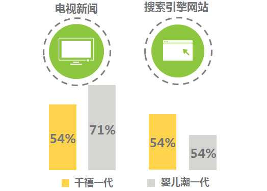 当问及通过什么方式获取新闻时,青年和老年消费者均青睐电视和搜索引擎。毫不意外的是,年轻一代更多的从网上获取新闻,同时,有半数以上(54%)“婴儿潮一代”消费者查看搜索引擎的新闻网站来关注时事。