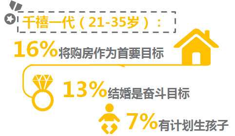对新兴消费力“千禧一代”的消费者来说,16%的21-34岁受访者将买房子作为人生首要解决的问题。另有13%的受访者表示结婚是奋斗目标之一。出人意料地是,生孩子并没有成为大家的关注焦点。仅有4%的“Z一代”和7%“千禧一代”将其提上议事日程。