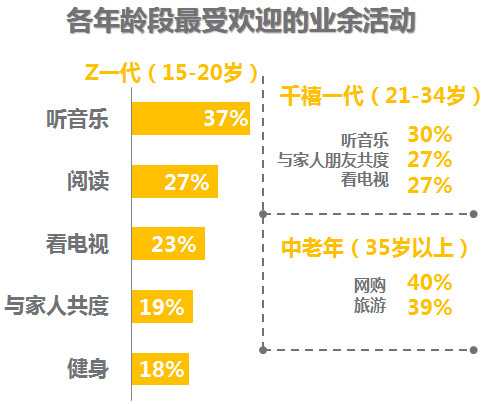 而中老年人更热衷于网购和旅游等需要一些闲钱和自由时间的活动。分别有40%和39%的中老年消费者将这两项作为首选活动。