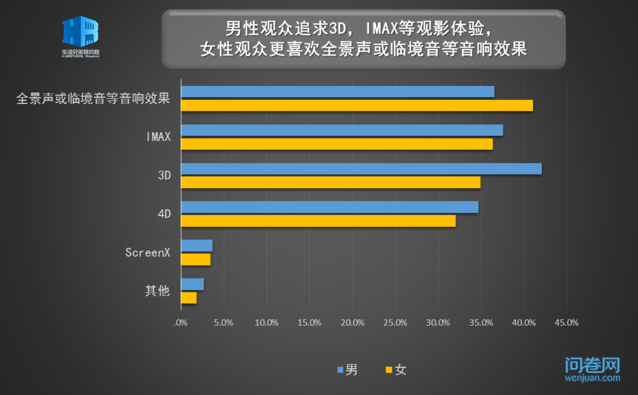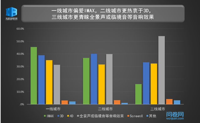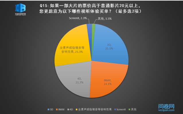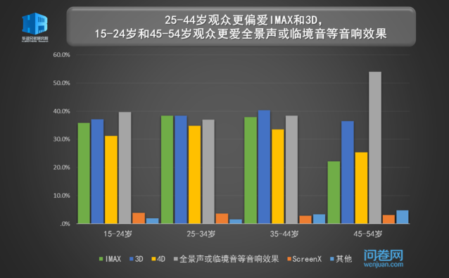 一部制作精良、画面恢弘的大片,必须要靠上乘的视听设备才能完美呈现,在3D和IMAX已经有些司空见惯了的当下,观众似乎开始对听觉上的“增值”游乐有更多的消费意愿。受访者中有四分之一的观众愿意多花20元享受全景声或临境音等音响效果,比3D和IMAX的购买意愿更多少许。
