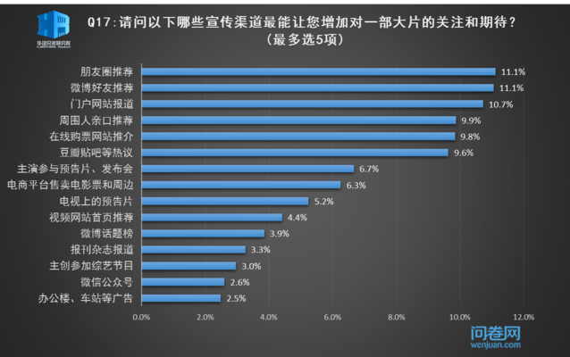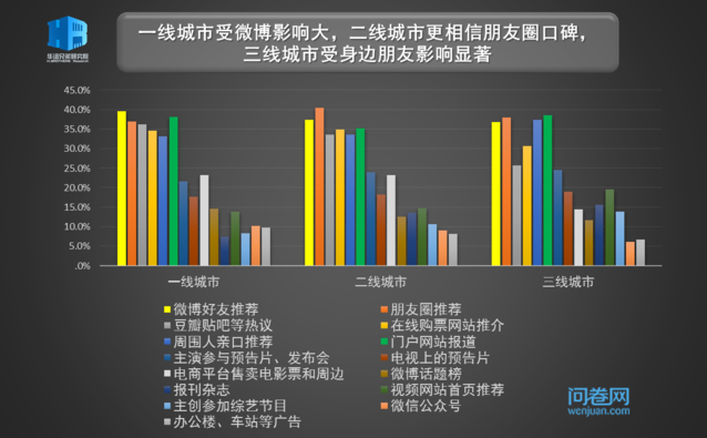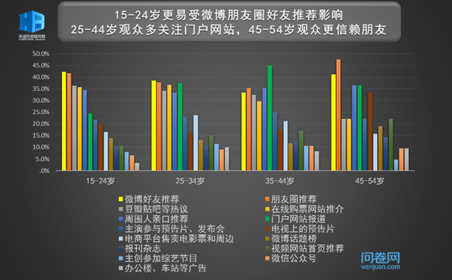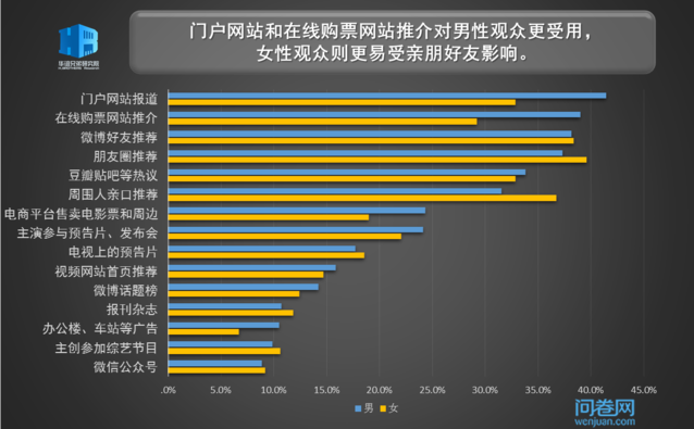 在当前的电影市场,宣发力度有时在冲击票房和排片量上起着至关重要的作用。就国产大片而言,较为强大的仍然是社交网络的宣传力量,朋友圈和微博好友推荐的效果不分伯仲,门户网站和在线购票网站的推介也不可小觑。我们再细分到不同性别、年龄、城市三个维度,来探究不同宣传渠道对于增加受访者对一部大片的关注和期待的效果。