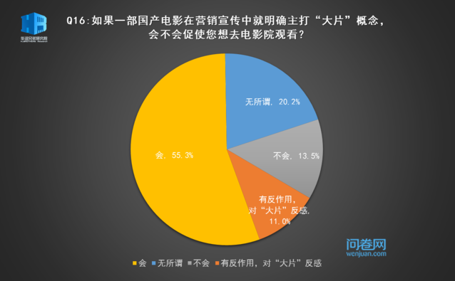有55.3%的受访者认为电影营销主打“大片”概念会吸引他们走进电影院,尽管可能起到反作用,不过对于大部分受访者来说“大片”概念还是较为受用的。
