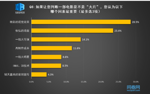 一千个观众就有一千个哈姆雷特,观众对大片的喜好应该和其心中对大片的定义有关。从下图我们可以得知在观众心目中决定一部电影是否称得上“大片”的三个关键因素是“精彩的视觉效果”“恢弘的场面”以及“一线大导演”。对于制作方一直看重的大成本、大卡司却并非是观众最在意的。