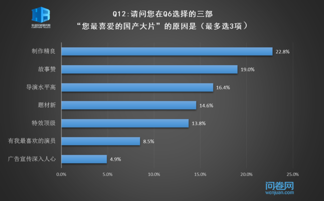 对于所选的“最爱的国产大片”,受访者认为“制作精良”“故事赞”“导演水平高”是主要原因。