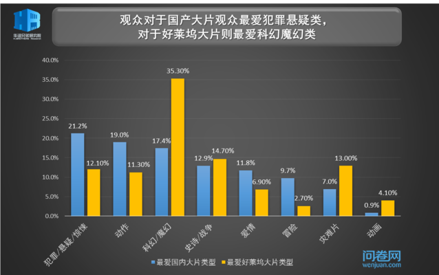 综合来看观众更青睐的国产大片类型和好莱坞大片类型,可能是受制于特效技术,对于科幻魔幻类以及灾难片类型,好莱坞大片的支持率遥遥领先,而对于犯罪悬疑以及动作类更注重情节的类型片,观众则更喜欢国产大片。