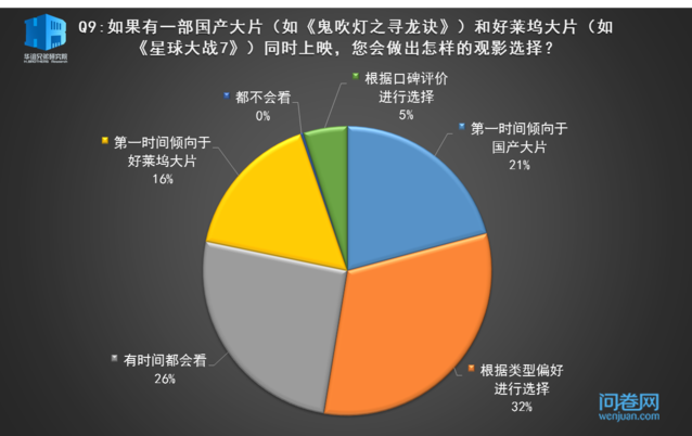 当面临好莱坞大片和国产大片同时上映的选择时,大部分观众还是会“根据类型偏好进行选择”,26%的观众表示“有时间都会看”,令人惊喜的是,还是有较多的受访者“第一时间倾向国产大片”。