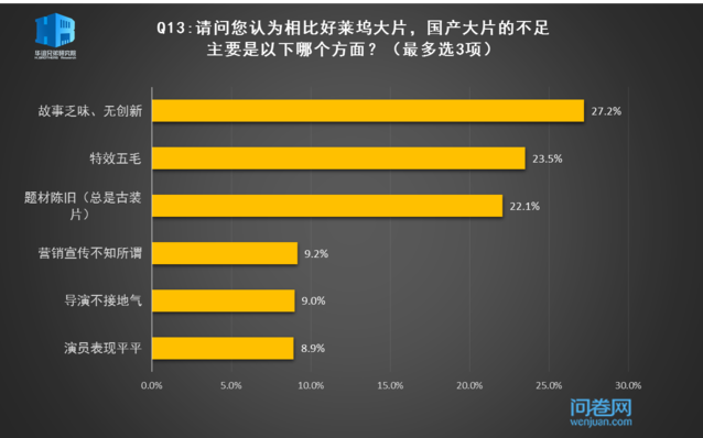 和好莱坞大片相比,“故事乏味、无创性”“特效五毛”“题材陈旧(总是古装片)”是受访者认为国产大片最大的不足。这也就不难理解为何时隔五年,《让子弹飞》依然令受访者记忆犹新、津津乐道。