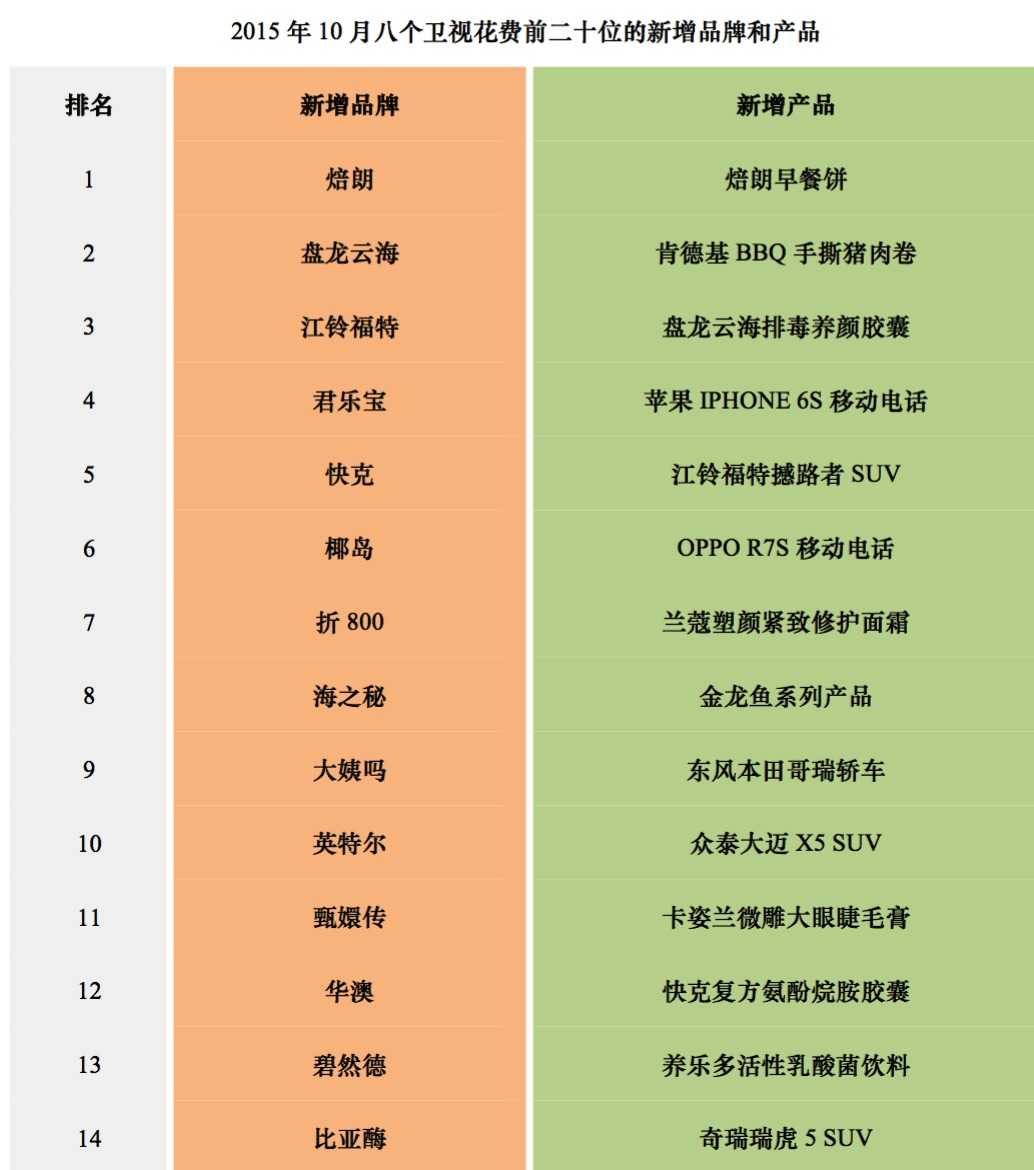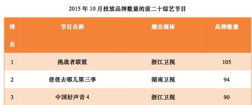 《挑战者联盟》的广告吸纳力逐渐增强。9月播出共有90个品牌,而在10月,已经增至105个。新增投放品牌包括了苹果、上海大众、上海大众斯柯达、华晨宝马、东风本田等。
