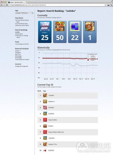 Mobiledevvhq是另外一种有趣的服务,据称与手机SEOmoz工具一样有效,并创造了一系列能够兼容于iTunes/Google Play的ASO工具,以此追踪应用的排名并帮助它们定位在应用商店中的关键词。