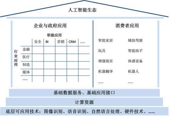 人工智能产业主要由底层可应用技术(图像识别、语音识别、自然语言处理、硬件技术等)、计算资源(大规模GPU集群)、基础数据服务,以及企业/政府/消费者应用组成。遵循产业的一般发展规律,人工智能的发展路径仍然是从底层可应用技术的成熟开始,再到商业化计算资源、数据服务等基础设施的完善,最后形成企业和消费者应用的繁荣。