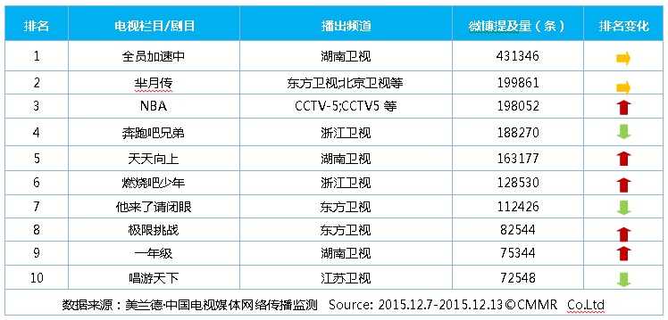2015年第50周在播电视栏目/剧目微博提及量TOP10