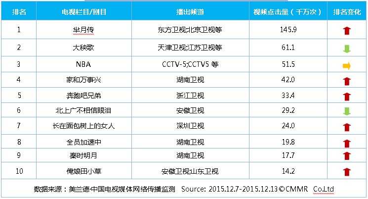 2015年第50周在播电视栏目/剧目视频点击量TOP10