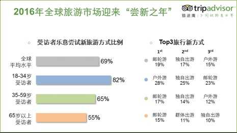 中国迎来尝新之年:全球69%的受访者表示想在2016年尝试不一样的旅行方式,中国受访者的这一比例高达83%,中国游客在新的一年里希望首次尝试的前三种旅行方式分别是:独自出游、邮轮游、户外游。其中80后和90后的“尝新”需求最为明显。