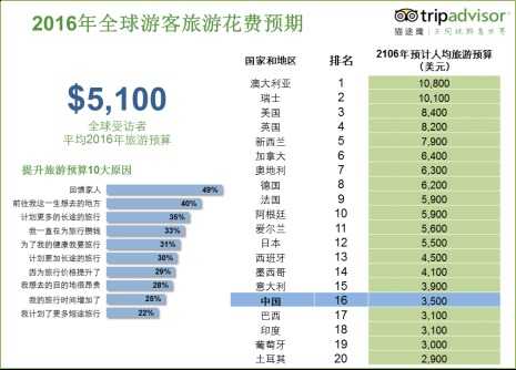 从全球范围内来看,年龄段在65岁以上的老年受访者的旅游年预算最为充足,平均达到8736美元,而18-34岁受访者相对保守,平均旅行预算为2915美元;从国家范围来看,澳大利亚受访者的年均旅游预算额度最高,达10800美元。中国受访者2016年的旅行预算在全球范围内排名第16,平均为3500美元(约22800元人民币),低于全球平均水平的5100美元(约33000元人民币),中国游客消费或将回归理性。