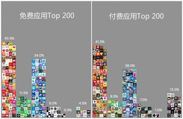 从图表中我们可以看到,无论是在免费应用Top 200还是付费应用Top 200中,红色和蓝色为主色的应用图标都是最受欢迎的。