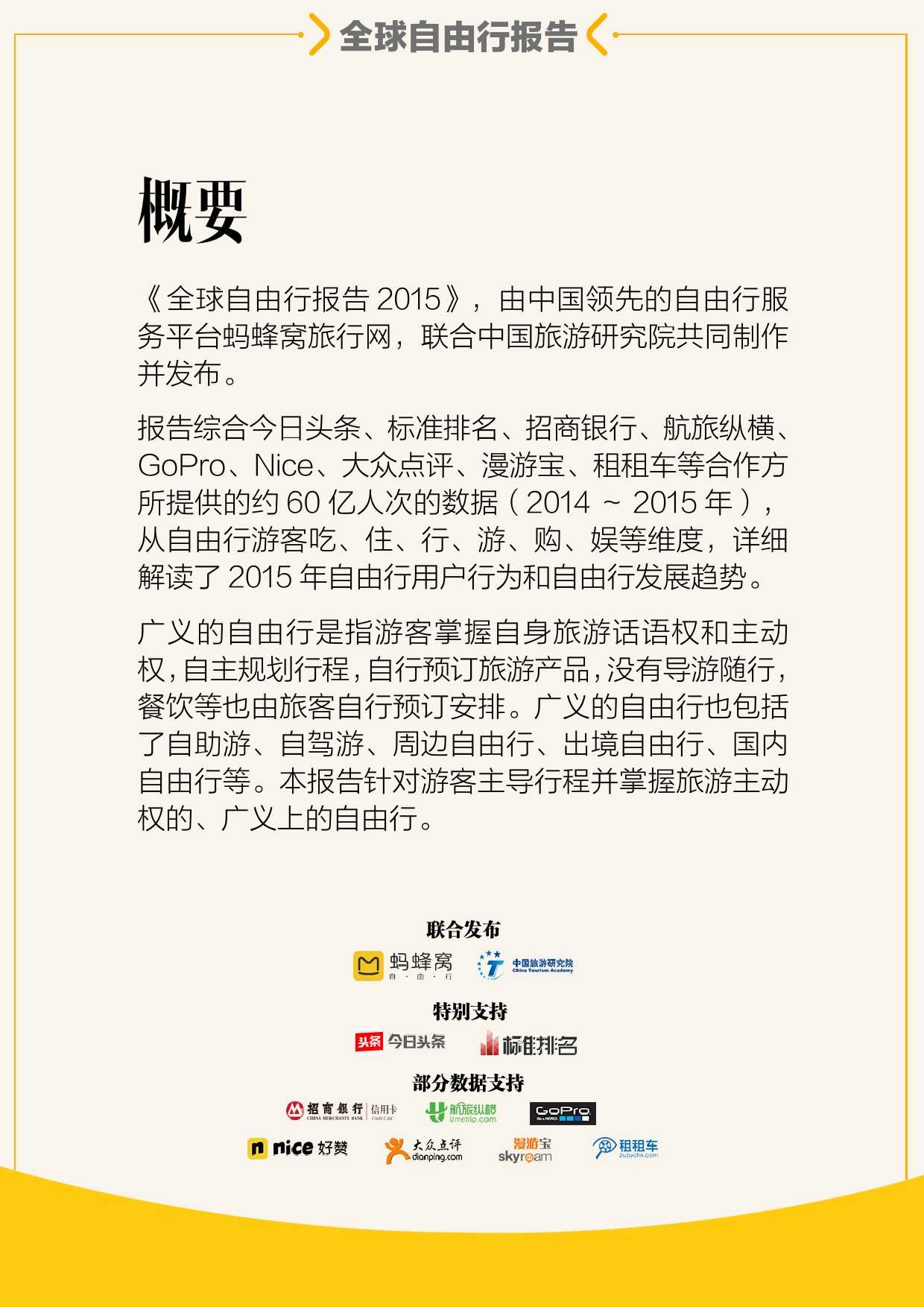 以蚂蜂窝旅游大数据为基础,报告综合了今日头条、标准排名、招商银行信用卡、航旅纵横、GoPro、Nice、大众点评、漫游宝、租租车等合作伙伴所提供的约60亿人次的自由行行为数据(2014~2015年),从自由行游客的饮食、住宿、出行、购物、当地游乐等维度,详细解读了2015年自由行用户行为和自由行发展趋势。